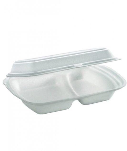 Термо ланч разделен на две секции. Цікаве рішення для пакування комплексного обіду. Паковання одноразове призначене для пакування та доставки готових гарячих і холодних страв. Не деформується під час контакту з гарячим, не спричиняє дискомфорту рукам. Має кришку, що не знімається. Кришка закривається за допомогою спеціальних «язичків», які заходять у отвори на основу. Охололу їжу не можна розігрівати в контейнері. А той факт, що вона тривалий час підтримує їжу теплою є незаперечним плюсом.